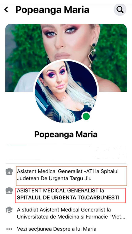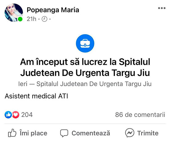 În echipa asistentelor medicale de la Spitalul Județean de Urgență Târgu Jiu a fost angajată o tânără în vârstă de 25 de ani care cu ușurință s-ar încadra și în categoria celor mai sexy tinere din oraș. Frumoasa Maria Popeangă, conform informațiilor găsite pe contul personal de pe o pagina de socializare, a urmat studiile ca asistent medical generalist în cadrul Universității de Medicină și Farmacie, „Victor Babeș” Timișoara. Tânără a fost angajată ca asistent medical în cadrul Spitalului de Urgență Târgu Cărbunești, iar de ceva vreme a fost angajată în cadrul Spitalului de Urgență Târgu Jiu pe secția de ATI.