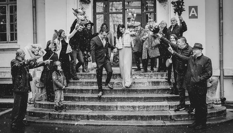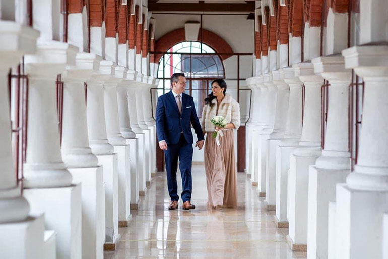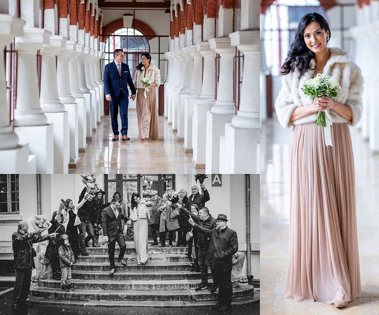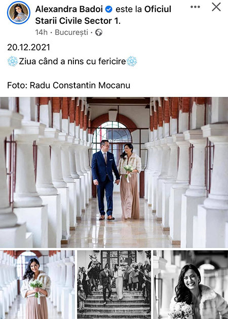 Cei doi s-au căsătorit civil la începutul acestei săptămâni, la Primăria Sectorului 1, având alături doar câteva rude şi prieteni. Surpriza a fost că, la ieşirea din primărie după oficierea căsătoriei, cei doi miri au fost acoperiţi de primii fulgi de nea din această iarnă. De altfel, şi Alexandra Bădoi şi-a anunţat evenimentul pe contul de socializare comentând „Ziua când a nins cu fericire”.