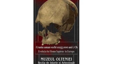 Craniu uman cu o vechime de 35.000 de ani găsit în Peștera Muierii, expus în muzeu