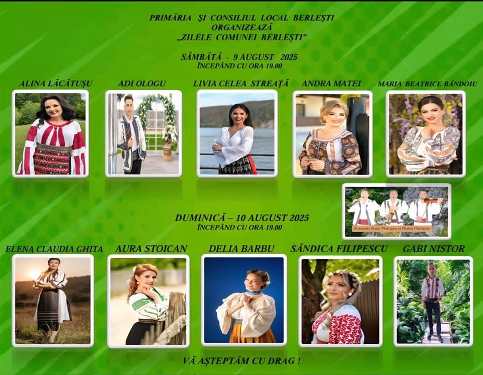 Autoritatea locală din Berlești face ultimele pregătiri pentru Zilele Comunei, eveniment care va fi organizat sâmbătă și duminică în localitate. Artiști de muzică populară vor încânta publicul prezent pe scena urcând Alina Lăcătușu, Adi Ologu, Livia Celea Streață, Andra Matei și Alice Beatrice Băndoiu. În a doua seara, atmosfera va fi întreținută de Elena Claudia Ghiță, Aura Stoican, Delia Barbu, Să ducă Filipescu și Gabi Nistor.